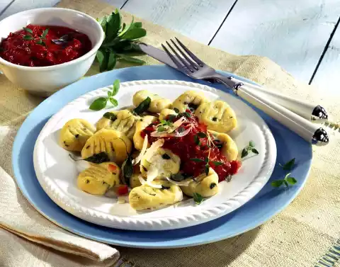 Arrange on plates together with the gnocchi and sprinkle with herbs and parmesan slices as desired.