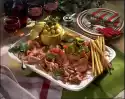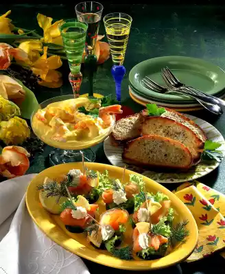 Cover the cucumber slices with some salad and salmon. Put the creamed horseradish in a piping bag with a star-shaped spout and squirt on the canapés. Garnish with lemon wedges and dill. Makes 12 pieces.