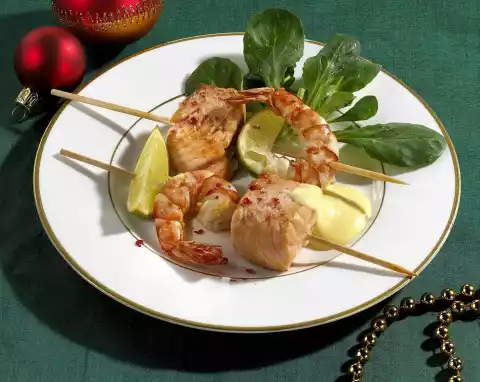 Wash the salmon, dab dry and cut into large cubes. Season with salt and sprinkle with lemon juice. Remove the shrimps from their shells and remove the intestines. Wash the lime, dab dry and cut into 8 slices.