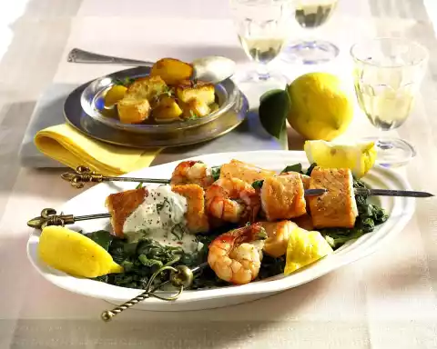 Season spinach with salt, pepper and nutmeg. Serve skewers with spinach, potatoes, sauce and lemon wedges.