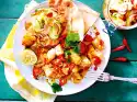 For the salad, clean and peel carrots and cut them into fine strips. Wash and drain the salad mix. Mix 1 tablespoon sesame oil, chilli chicken sauce, lime juice and 1 tablespoon mayonnaise. Mix with carrot strips and salad.