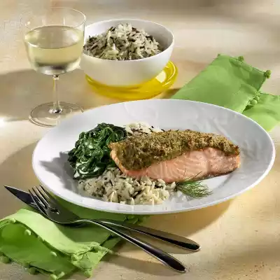 Season with salt and pepper. Drain the rice and let it drain. Arrange salmon with rice and spinach and garnish with dill.