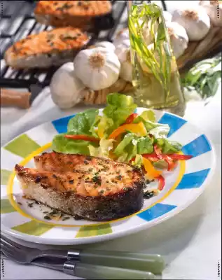 Pour over the salmon chops and leave covered for about 30 minutes in the fridge to marinate. Dab the salmon lightly and grill on a barbecue grill on each side for 6-8 minutes. Season with salt and pepper. In the meantime clean, wash and drain the salad and pluck into bite-sized pieces. Clean, wash and cut the peppers into fine strips. Peel and finely chop the onion. Add to vinegar and mix. Add remaining oil and fold in. Season with salt and pepper.
