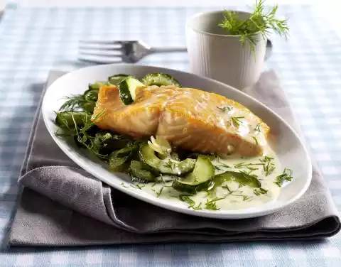 Heat the oil in a coated pan and fry the salmon for 3-4 minutes on each side. Take out and keep warm. Sauté onion and cucumber in the frying fat. Season with salt and pepper, cover and stew for about 5 minutes over a mild heat.