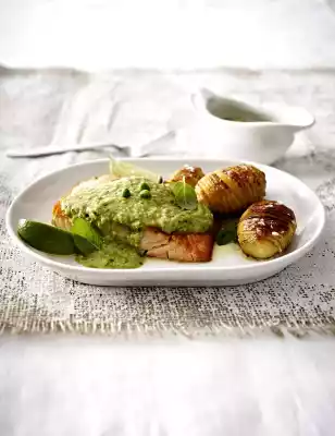 Meanwhile, wash the fish, dab dry and cut into 4 equal pieces. Heat the lard in a large pan, fry the fish for about 2 minutes on each side, season with salt and pepper. Arrange fish, sauce and potatoes on plates. Sprinkle potatoes with sea salt, garnish sauce with mint and peas. If necessary add lime wedges