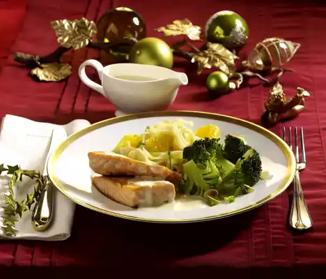 Arrange salmon, broccoli, orange-porree-noodles and sauce on plates.