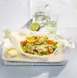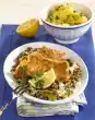 4. bake in a hot oven (electric cooker: 200 °C/circulating air: 175 °C/gas: level 3 for approx. 10 minutes. Garnish with crushed pink berries, dill and lime. Boiled potatoes taste good with it