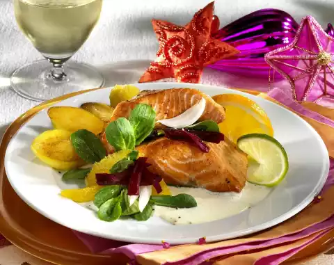 Serve fish, potatoes, sauce and salad in portions, garnish with lime and lemon slices.