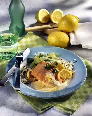 Deglaze frying fat with milk, bring to the boil. Add lemon juice. Thicken sauce. Season to taste with salt and pepper. Add fish and lemon slices to the sauce, heat up briefly. Drain rice and leek if necessary. Arrange everything and garnish with parsley and lemon peel if necessary