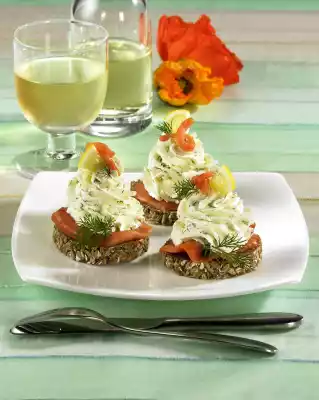 Pour the cream into a piping bag with a star-shaped spout and spray it onto the salmon slices. Serve garnished with salmon strips, dill flags and lemon corners.