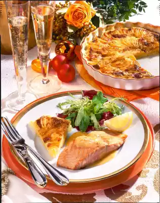 Quarter the remaining onion. Boil up with fish stock, champagne, ci- trone, bay leaf, peppercorns and a little salt. Simmer for about 4 minutes.
