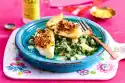 Grease a large ovenproof dish, sprinkle in shallots and place fish fillets on top. Pour the wine. Close the mould with aluminium foil. Bake in the preheated oven (electric cooker: 200 °C/circulating air: 175 °C/gas: see manufacturer) for about 10 minutes. Drain potatoes, quench, peel and mash them finely with a fork while still warm. Let them cool down.