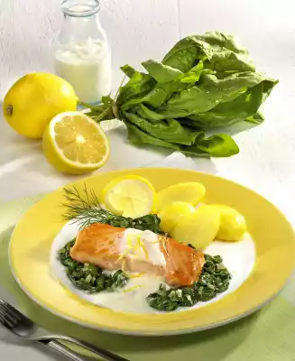 Spinach clean, wash. Wash lemon, rub dry. Cut off 4 slices to garnish. Peel off the rest of the peel in fine strips, squeeze out the juice