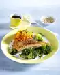 Mix spinach, peppers and dressing and arrange on plates with the salmon fillets
