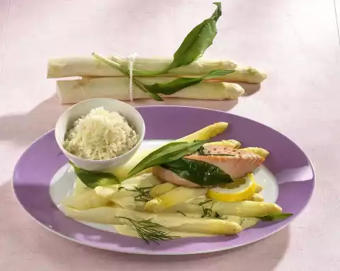 Stir in the remaining strips of garlic. Season with salt and pepper. Serve asparagus, sauce, salmon fillet and rice garnished with wild garlic leaves, dill and lemon in portions.