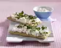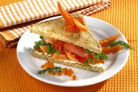 Toast bread and spread a thin layer of cream cheese on top. Cut the bread diagonally. Cover two triangles with papaya, salmon, herbs and salmon caviar. Place remaining toast triangles on top and garnish each with a slice of papaya and some caviar.