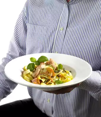I now season the sauce with salt, pepper and lemon juice. Add the salmon, mix pasta and vegetable strips and grind black pepper over it. Finally I garnish with basil leaves