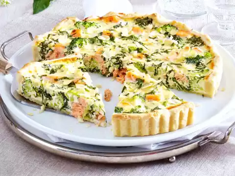 Clean and wash the broccoli and cut it into florets. Cook in boiling salted water for 3-4 minutes. Pour carefully into a sieve and drain well. Roll out the dough and line a greased tart tin (26 cm Ø) with it.