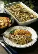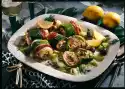 Spread the salmon slices with the horseradish cream, roll up and cut into 1 cm thick slices. Mix lemon juice with salt, pepper and sugar, add oil. Wash the cucumber, remove seeds, cut into small cubes and add to the vinaigrette.
