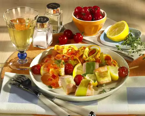 Wrap each salmon cube with one leek strip. Put them alternately with lemon and tomato on 8 skewers. Remove seeds from remaining tomatoes and cut into small cubes. Peel, halve and finely dice the shallot.