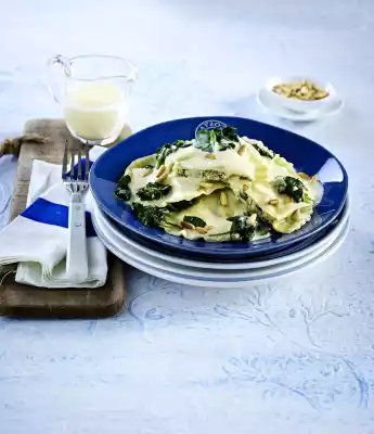 Peel and finely dice the shallots. Sort and wash the spinach. Heat the oil in a pot and sauté the shallots. Add the spinach and let it collapse. Season with salt, pepper and nutmeg. Remove half of the spinach mixture from the pot, let it cool down a little and chop it finely. Place the second half in a bowl and chill. Crumble the salmon. Separate egg. Mix egg yolk, ricotta, chopped spinach and salmon, season with salt and pepper. Roast the pine nuts in a pan without oil, remove