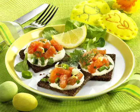 Mix sour cream and horseradish, season with salt and pepper. Clean and wash spring onions and cut into fine rings. Cut salmon fillet into small pieces and mix with the spring onions. Quarter the pumpernickel slices. Add 1 blob of horseradish cream to each slice. Spread salmon tartare on top. Serve garnished with salad, lemon wedges and dill