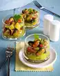Salmon tartare quartered. Place a dessert ring (approx. 8 cm Ø) on a plate, fill with approx. 1/4 tartar, press lightly. Pull the ring up carefully. Also place 3 more tartar towers on plates, garnish with dill flags.