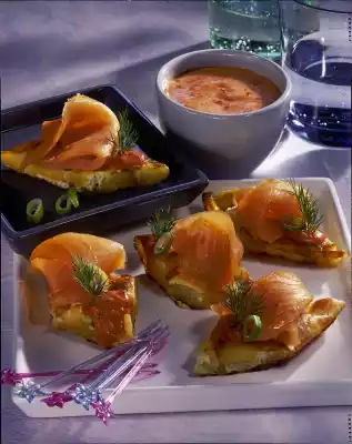 Season with salt and pepper. Stir eggs and milk until smooth. Season with salt and cayenne pepper. Pour over the potatoes and spring onions and bake in the preheated oven (electric cooker: 225 ° C/ gas: level 4) for about 30 minutes. Remove from oven and let it cool down for about 30 minutes. Cut into approx. 5 cm large rhombs. Cut smoked salmon into approx. 35 slices weighing approx. 15 g and place them on the rhombs. Stir paprika paste and salad cream until smooth. Wash the dill, dab dry and pluck off small bunches.