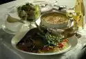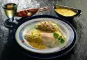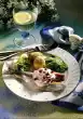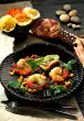 Arrange the fish and vegetables on a plate. Serve garnished with lemon wedges and parsley.