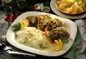 Clean the mushrooms, wash them. Chop half finely. Cut the rest into slices. Mix the prepared ingredients. Fill into the incised slots and into the abdominal cavity. Cut the rest of the lemon into slices and place them in the abdominal cavity as well.