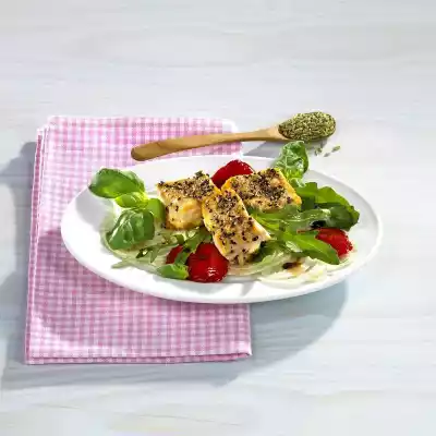 Sprinkle the top first with salt, then with the fennel and pepper mixture and press the spice into the meat with your fingertips. Spread a non-stick ovenproof pan with a little oil and heat it up. Place the salmon with the spiced side in the pan and fry for 3 minutes until the fillet edge has a light crust. Place the pan in the preheated oven (electric range: 175 °C/ convection oven: 150 °C/ gas: 2 settings) and bake for 3-5 minutes. Arrange rocket, fennel, bell pepper and basil on a plate. Place salmon fillet on top