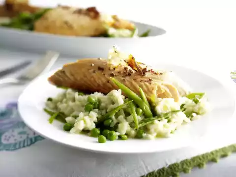 Wash the sugar snap peas and cut them a little finer lengthwise. Add the frozen peas to the risotto for the last 10-12 minutes of cooking time. Grate the parmesan and stir into the risotto. Refine risotto with cream.