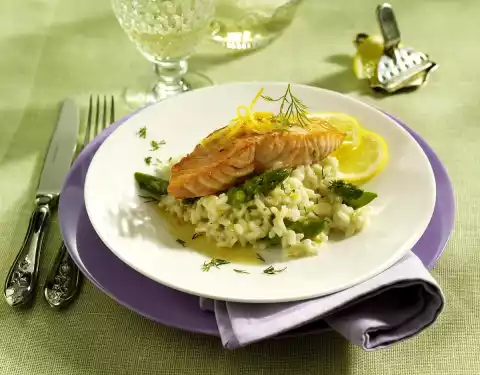Wash the dill and dab dry, put some aside for garnishing, chop the rest. Season risotto with salt and pepper. Serve the rice with the salmon, sprinkle with dill. Garnish with dill and lemon slices.