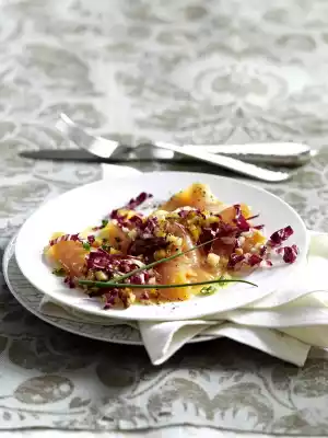 Arrange salmon and radicchio on plates. Add potato and apple vinaigrette. Garnish with remaining chives and sprinkle with freshly ground pepper.