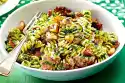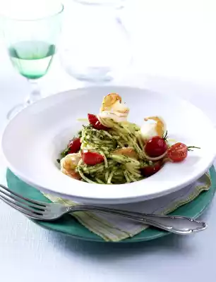 Drain the pasta and let it drain well. Mix with salsa verde, tomatoes and prawns and serve.