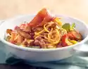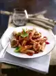 Cook the pasta in boiling salted water according to the instructions on the packet. In the meantime peel the shallot and dice it very finely. Wash and halve the tomatoes. Heat 2 tablespoons of oil in a frying pan. Fry the prawns for about 2 minutes, turning them over.