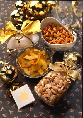 Mix oil and salt in a bowl. Spread the almonds on a baking tray. Roast in a preheated oven (electric cooker: 200 °C/ gas: level 3) for 6 minutes until golden brown. Let the almonds cool down. Fill into cellophane bags and decorate with festive ribbon