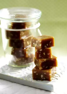 Lightly roast the almonds in a pan without fat, then let them cool down. Caramelize sugar in a pot until golden brown. Add butter, cream and salt. Simmer over medium heat while stirring for about 10 minutes until the mixture starts to bubble. Line the bottom of a box form with baking paper. Stir the almonds into the caramel mass and fill the mass into the tin. Refrigerate the caramel for about 4 hours, then remove from the tin and cut into pieces