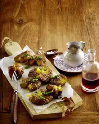Wash potatoes thoroughly and cook in boiling salted water for about 18 minutes. Drain potatoes and let them evaporate in the pot. Place them side by side on a baking tray lined with baking paper and press each one flat with the bottom of a glass, so that the potatoes burst open.