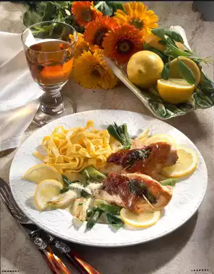 Wash the chicken fillets and pat them dry. Stick 1 slice of ham and 1-2 sage leaves on each with a wooden skewer. Season the fillets with salt and pepper and fry them in hot oil while turning for about 15 minutes. Meanwhile cook the noodles in boiling salted water for about 8 minutes. Clean, wash and cut the spring onions into large pieces. Remove the chicken fillets from the pan and keep warm. Fry spring onions in frying oil for 3-5 minutes.
