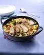 Heat briefly. Arrange spinach-cream pasta and saltimbocca of chicken fillet covered with sage leaf and drizzled on plates.