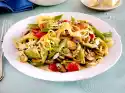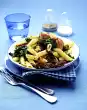 Put one slice of ham and 2-3 sage leaves in each, fold them up and stick them together with a wooden stick. Cook the pasta in boiling salted water according to the instructions on the packet. Heat 2 tablespoons of oil in a frying pan, fry the meat in it over medium heat on each side for about 6 minutes.