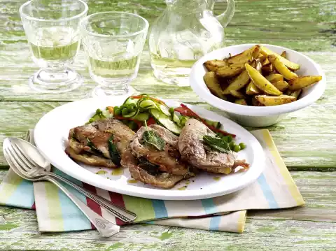 Leave to stand for a short time and season to taste. Wash the meat, dab dry and possibly tap flatter. Season with salt and pepper. Wash and pluck the sage. Cover cutlets with 1 slice of ham and 1-2 sage leaves each, fold up and pin.