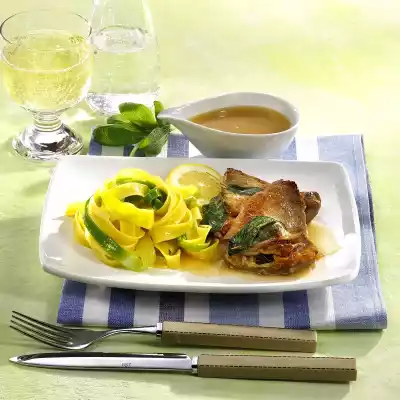Add butter cubes bit by bit. Season to taste with lemon juice, salt, pepper and sugar. Add leek one minute before the end of the pasta cooking time. Drain the leek noodles and let them drain. Arrange on plates with Saltimbocca and sauce. Serve garnished with lemon