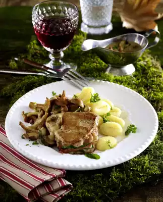 Clean, wash and cut the spring onion into rings. Stir the spring onion and half the parsley into the sauce. Serve the saltimbocca, gnocchi and mushroom sauce, sprinkle with the remaining parsley.