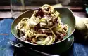 Heat 2 tablespoons of oil in a large frying pan, add Saltimbocca and fry on each side for about 4 minutes. Peel and finely dice the onion. Clean, wash and halve the mushrooms. Wash and clean the chanterelles and stock sponges.