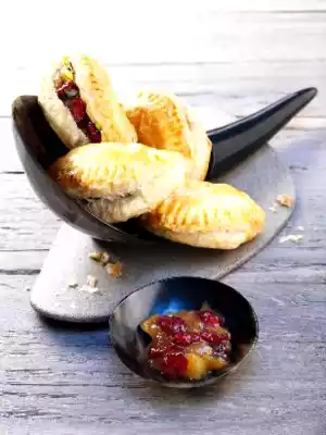 Mix mango chutney with cranberries and serve with the samosas.