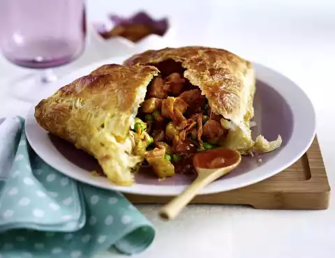 Place the remaining plates on top, press the edges, knock in a little. Place on the sheet. Brush with remaining egg. Bake in the oven for 15-20 minutes until golden brown. Serve hot or cold. Goes well with chutneys.