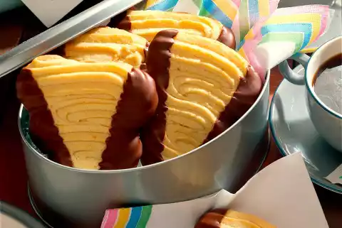 Repeat the procedure. Place a bowl in a pot with some water. Add the chocolate coating to the bowl and let it melt at low heat. Stir frequently. Dip one long side of the sandy pastry in the chocolate coating, turn it over the tip and dip the opposite side in the chocolate coating.