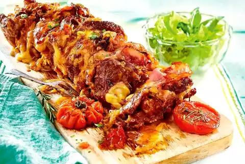 Place the slices of meat with the open side facing upwards and the onion rings in the tin (set the tin slightly at an angle so that the ingredients for the sandwich roast can be layered in easily). Season each layer with a little salt. Tie the meat firmly with kitchen string. Roast in the preheated oven (electric cooker: 180 °C/circulating air: 160 °C/gas: see manufacturer) for approx. 2 hours. Cover with baking paper after about 1 hour.